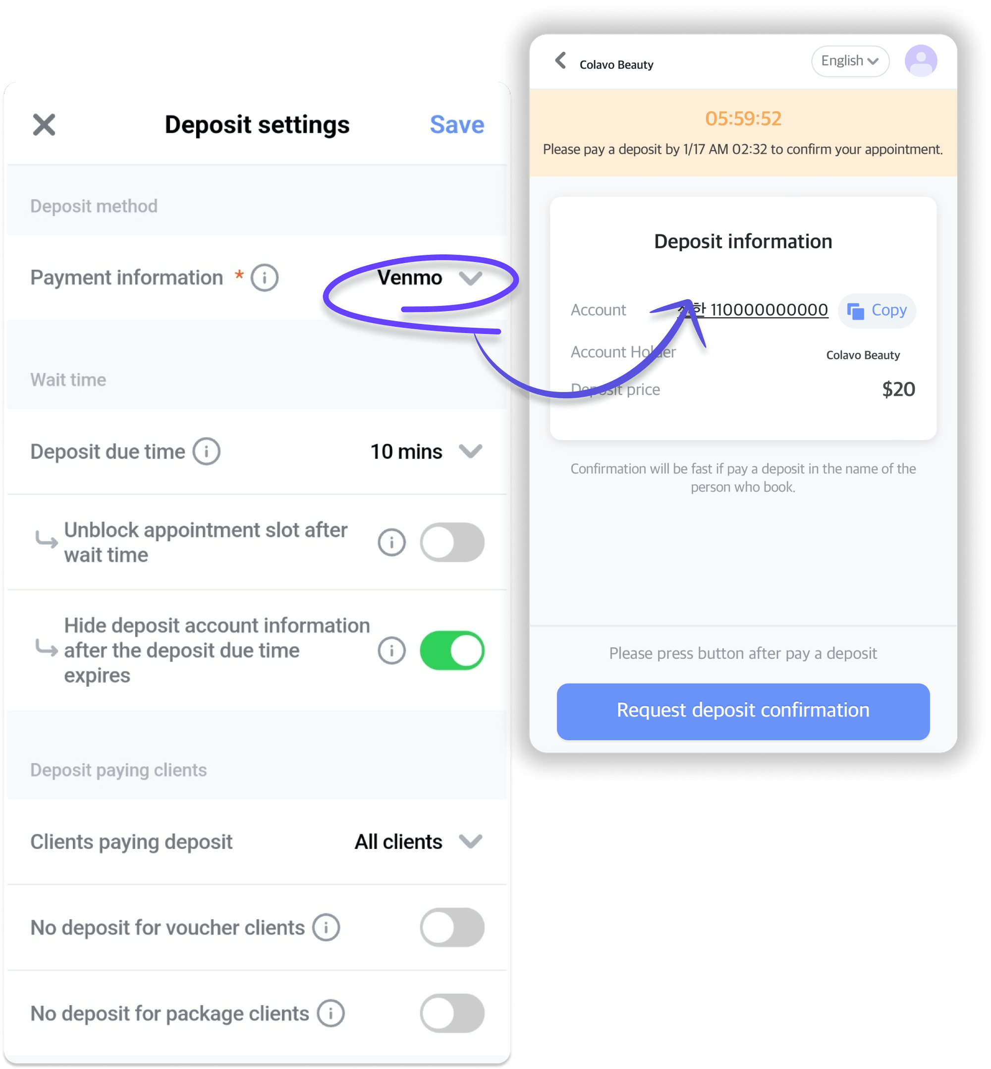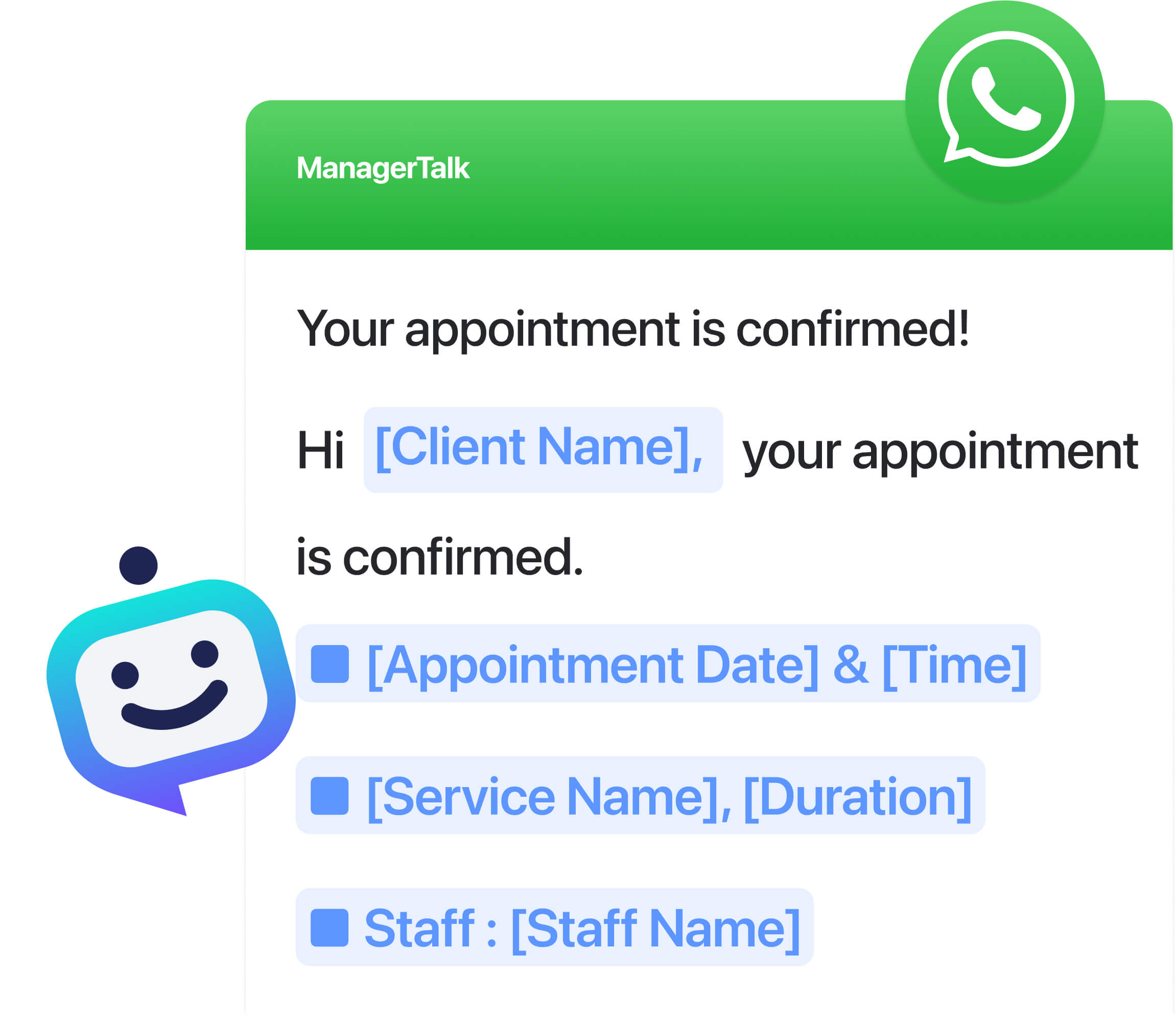 Clients can receive real-time WhatsApp notifications for any appointment updates, including deposit info, bookings, rescheduling and cancellations.
