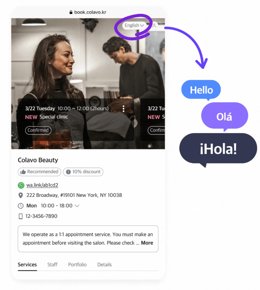 Clients can also find the salon’s contact info, location, working hours, and policies.
