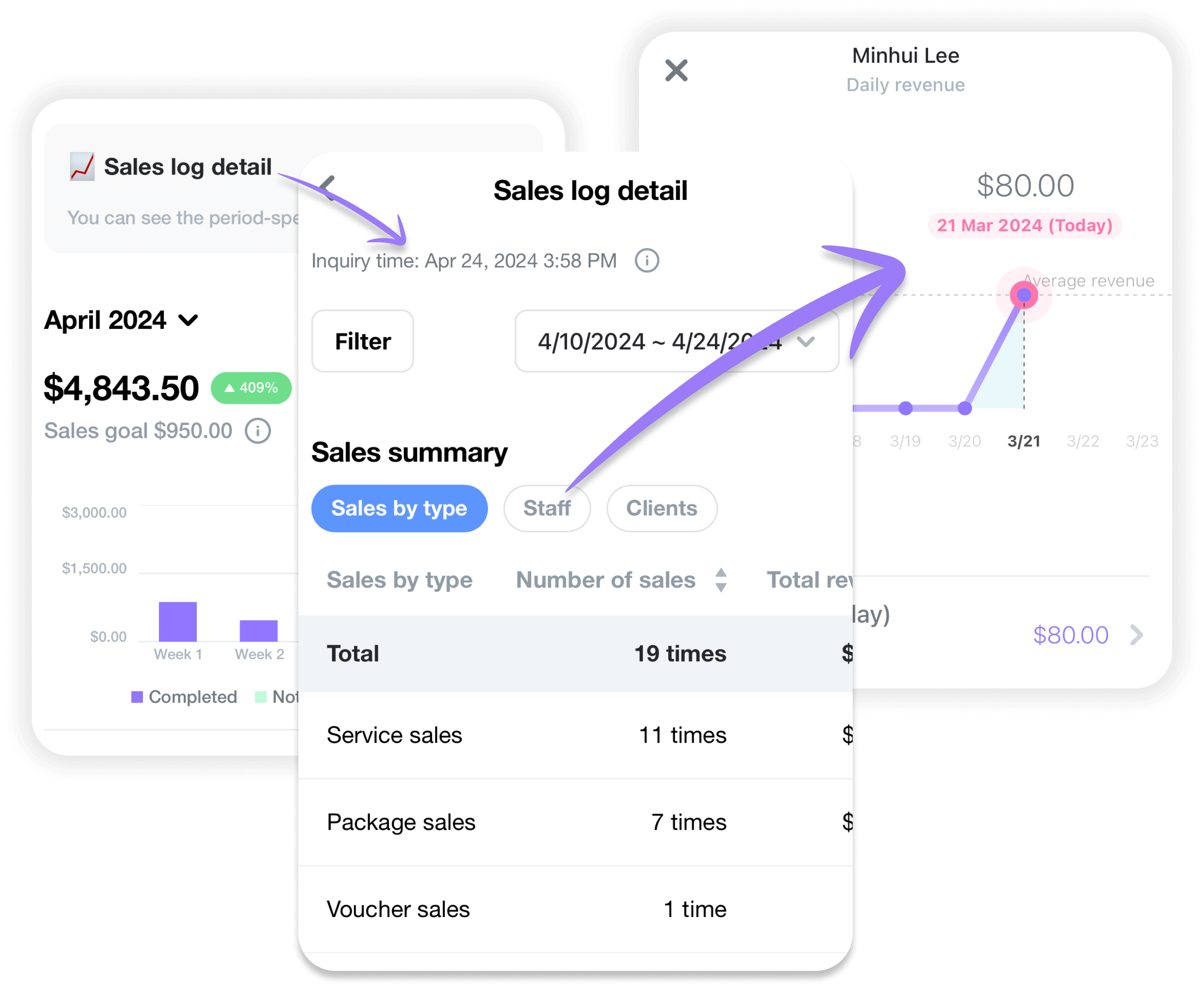 All sales information, from the salon and individual staff, is structured in an easy-to-read timeline over days and months to gain insights into your financial performance.
