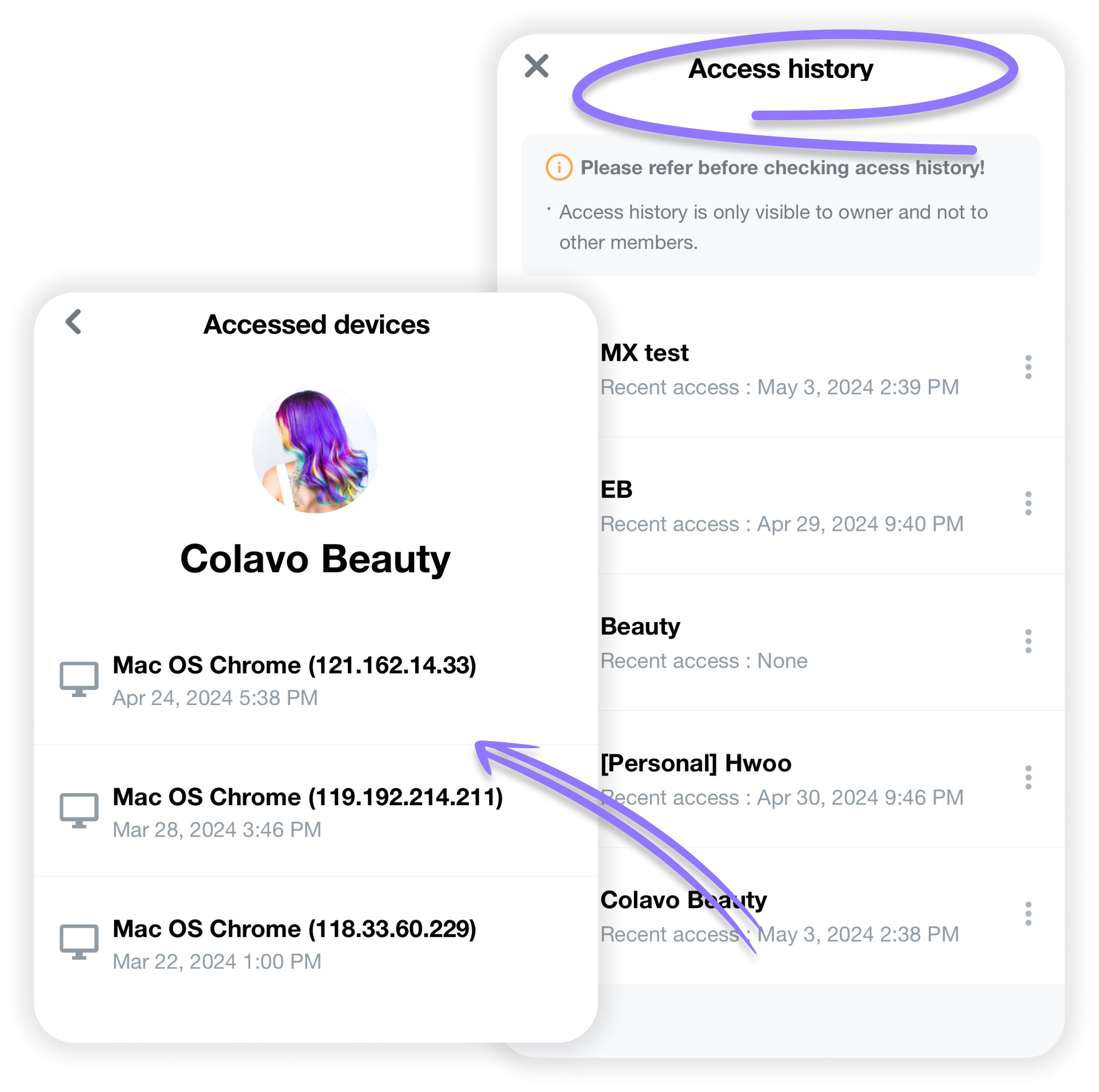 The "Login track" feature offers insights exclusively to the salon owner, monitoring staff activity effortlessly - from last logins to device specifics and recent actions.